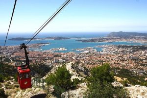 Nous avons pris le bus pour rejoindre le départ du téléphérique. Il est long de 1437m et le câble est porté par 5 pylônes. Il avance à une vitesse de 6m/s. Il nous a permis de monter au sommet du mont Faron à 584m d’altitude.